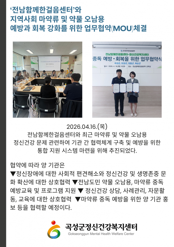 ‘전남함께한걸음센터’와 지역사회 마약류 및 약물 오남용 예방과 회복 강화를 위한 업무협약(MOU)체결