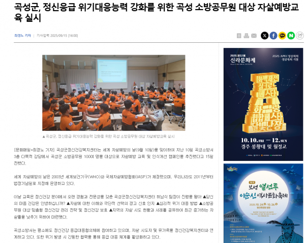 곡성군, 정신응급 위기대응능력 강화를 위한 곡성 소방공무원 대상 자살예방교육 실시. 페이지 정보 작성자 관리자 댓글 0건 조회 39회 작성일 25-10-01 11:15 본문 곡성군, 정신응급 위기대응능력 강화를 위한 곡성 소방공무원 대상 자살예방교육 실시:문화매일 목록 이전글곡성군, 어르신 마음 돌보는 ‘생명지킴이’ 양성…노인 우울 예방 본격화 다음글곡성군정신건강복지센터, 세계 자살 예방의 날 맞아 생명존중 캠페인 전개 댓글목록 댓글목록 등록된 댓글이 없습니다.