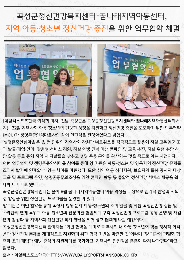 곡성군정신건강복지센터-꿈나래지역아동센터, 지역 아동·청소년 정신건강 증진을 위한 업무협약 체결
