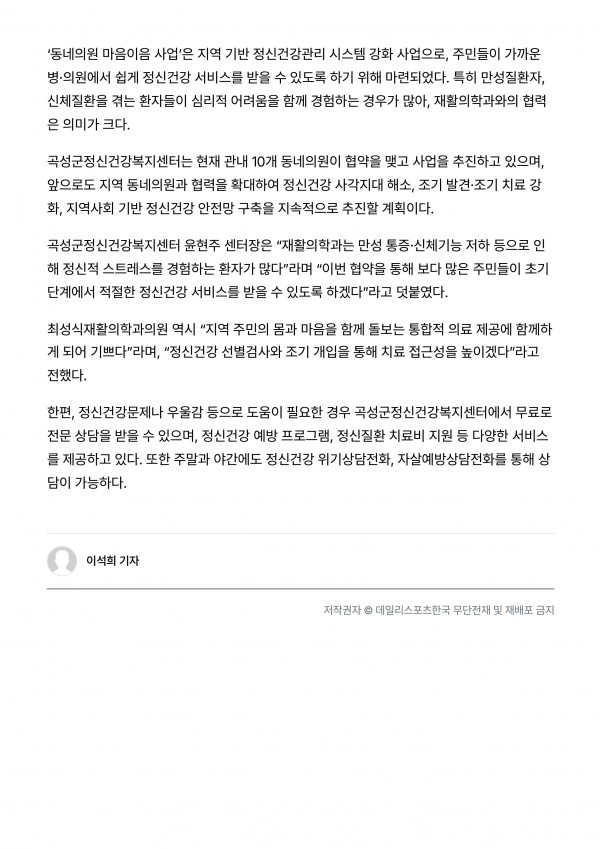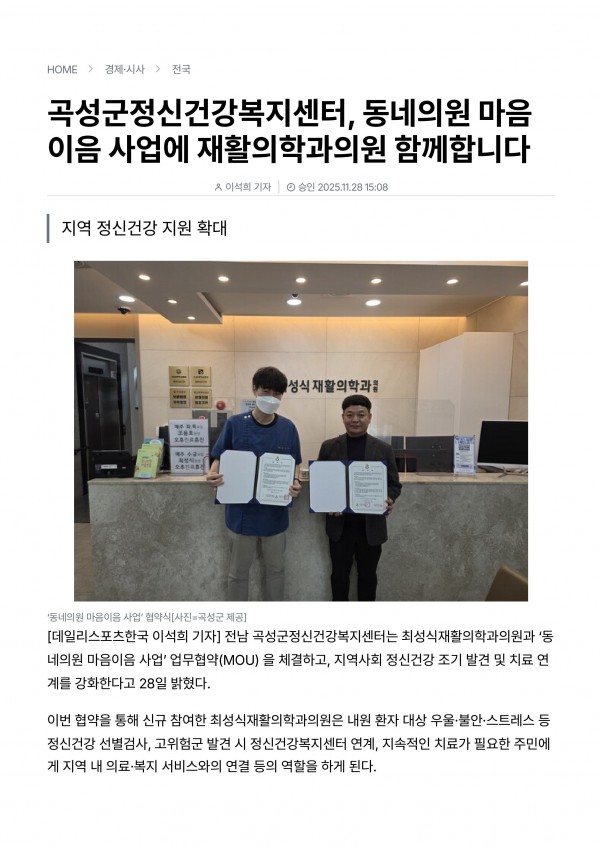 곡성군정신건강복지센터, '동네의원 마음이음 사업'에 재활의학과의원 신규 참여 페이지 정보 작성자 관리자 댓글 0건 조회 76회 작성일 25-11-28 17:29 본문 곡성군정신건강복지센터, '동네의원 마음이음 사업'에 재활의학과의원 신규 참여 목록 다음글곡성군정신건강복지센터-꿈나래지역아동센터, 지역 아동·청소년 정신건강 증진을 위한 업무협약 체결 댓글목록 댓글목록 등록된 댓글이 없습니다.
