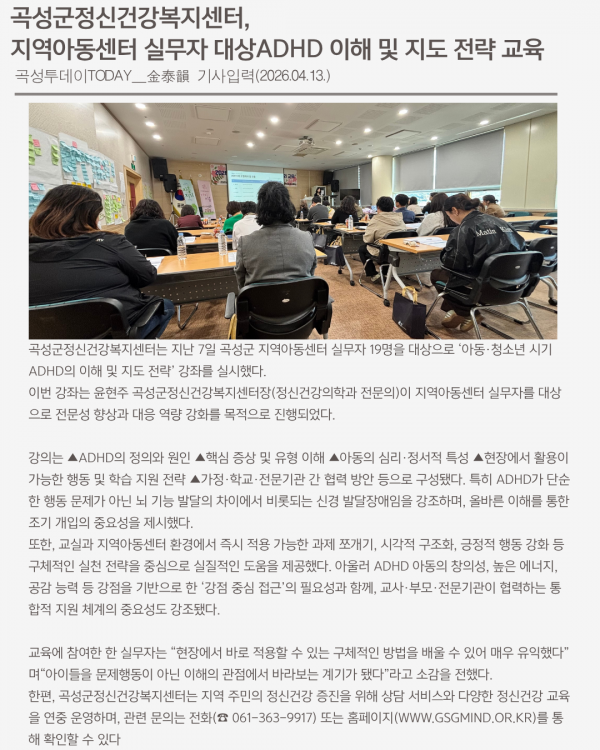 곡성군정신건강복지센터, 지역아동센터 실무자 대상 ADHD 이해 및 지도 전략 교육 페이지 정보 작성자 관리자 댓글 0건 조회 48회 작성일 26-04-17 10:50 본문 [곡성투데이] 곡성군정신건강복지센터, 지역아동센터 실무자 대상 ADHD 이해 및 지도 전략 교육 목록 다음글곡성군정신건강복지센터, 자살 고위험 시기 맞아 예방 홍보 펼쳐 댓글목록 댓글목록 등록된 댓글이 없습니다.