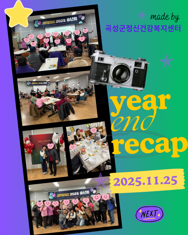 2025년 곡성군정신건강복지센터 송년회 페이지 정보 작성자 관리자 댓글 0건 조회 10회 작성일 25-12-16 13:44 본문 2025년 한 해를 마무리하며 곡성군정신건강복지센터 송년회를 진행하였습니다. 2025년 11월 25일 회원, 기관 담당자, 보건 의료원 식구들과 함께한 송년회한 해를 돌아볼 수 있는 뜻 깊은 자리가 되었습니다. 목록 이전글이전글제목입니다. 17.07.14 다음글다음글제목입니다. 17.07.14 댓글목록 댓글목록 등록된 댓글이 없습니다.