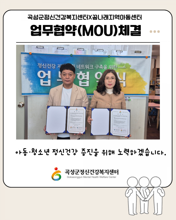 2025.10.22.(수) 곡성군정신건강복지센터와 꿈나래지역아동센터가 지역사회 아동청소년 정신건강을 위한 업무협약을 체결하였습니다.