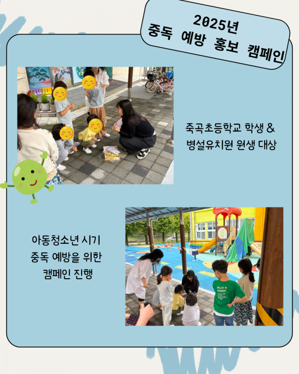 2025년 10월 16일 (목) 죽곡초등학교 전교생 및 병설유치원 원생을 대상으로 아동청소년 시기 중독 예방을 위한 중독 예방 홍보 캠페인을 진행하였습니다.