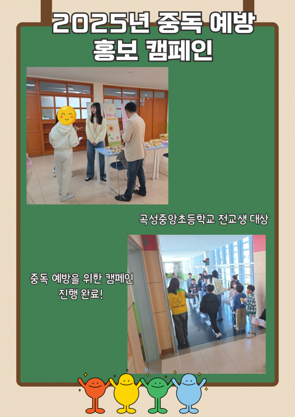 2025년 10월 28일 (화) 곡성중앙초등학교 전교생을 대상으로 아동청소년 시기 중독 예방을 위한 중독 예방 홍보 캠페인을 진행하였습니다.