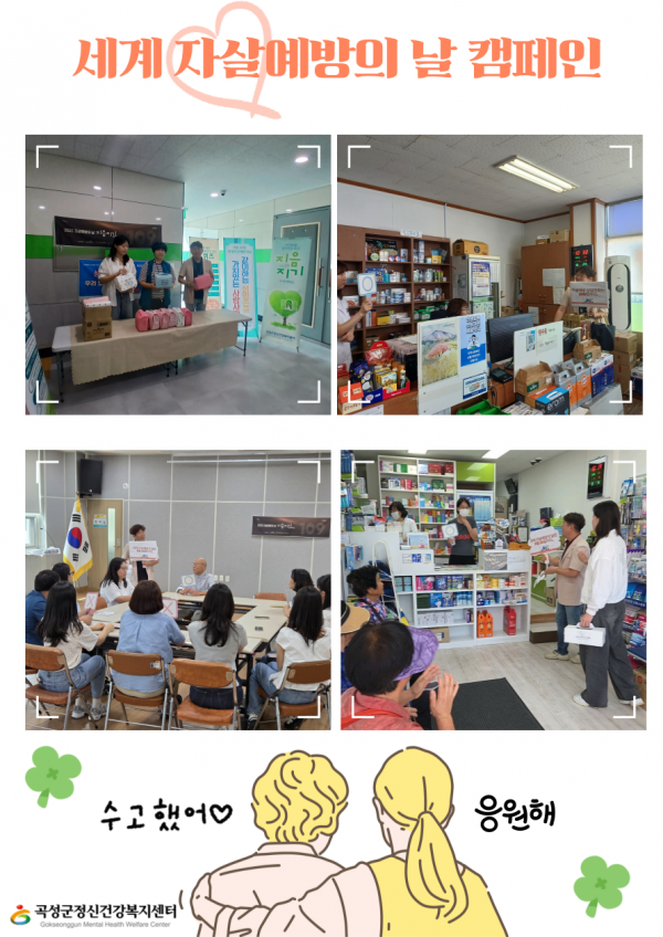 세계 자살예방의 날을 맞이해서 관내 농약사, 약국, 번개탄 판매업소, 유관기관 관계자 및 군민들 대상으로 자살예방 캠페인을 진행했습니다.
